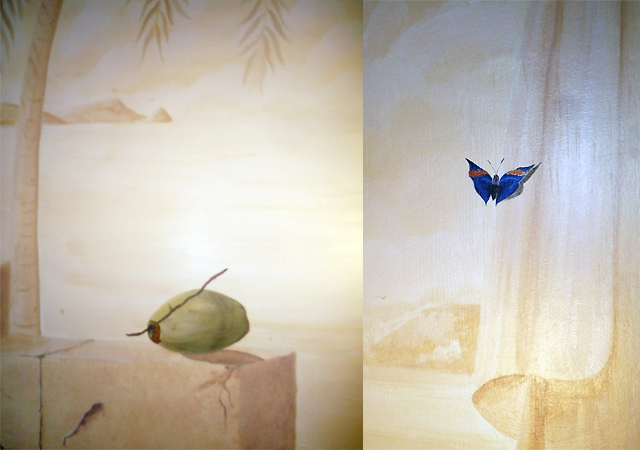 Ces fresques peintes directement sur le mur d’un couloir dans une maison de campagne près de St Malo traite d’un sujet exotique propice à l’évasion. Comme tout décor peint, son but est d’élargir virtuellement l’espace. Cela donne une impression de profondeur et de perspective par la technique du trompe l’œil.